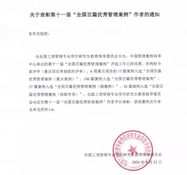据悉,“全国百篇优秀管理案例”由全国工商管理专业学位研究生教育指导委员会主办、中国管理案例共享中心承办,是中国管理案例的最高奖项,被誉为全国管理案例教学界“奥斯卡”。评选出的优秀案例将收入中国管理案例共享中心案例库,并推荐给加拿大毅伟商学院案例库在全球英文发行。教育部已将“百优”案例列为学科评估指标体系(C5项)。国内多所MBA培养院校相继制定鼓励政策。